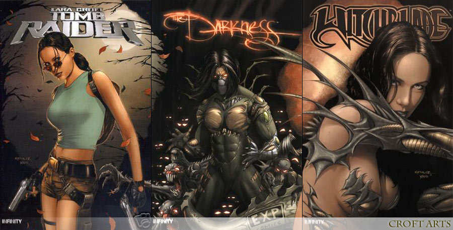 Die drei Triptychon-Cover von Daniel Kessler (Tomb Raider #28 Variant, Darkness #16 Variant, Witchblade #42 Variant) ergeben zusammen ein Comic-Triptychon, also ein großes Gesamtbild.